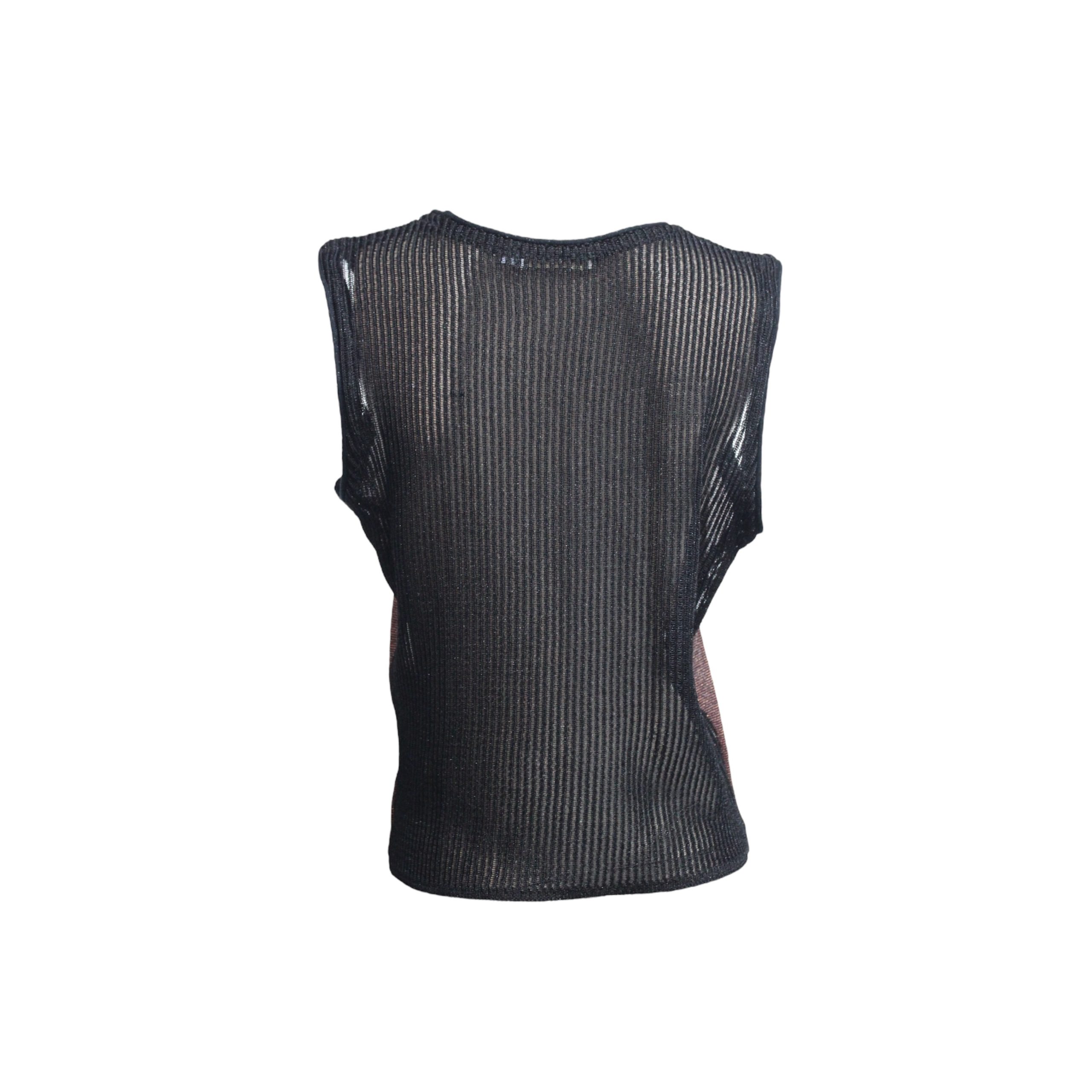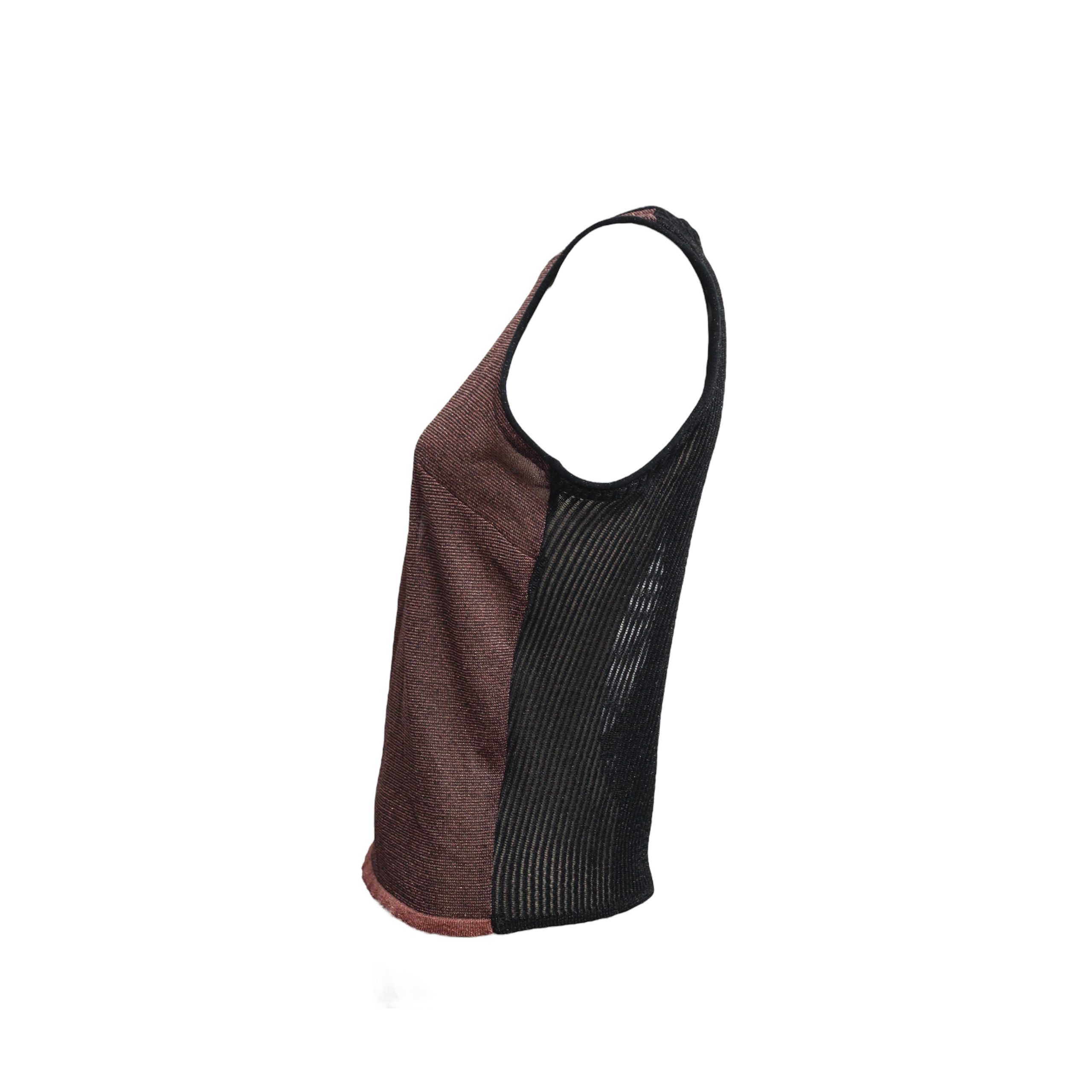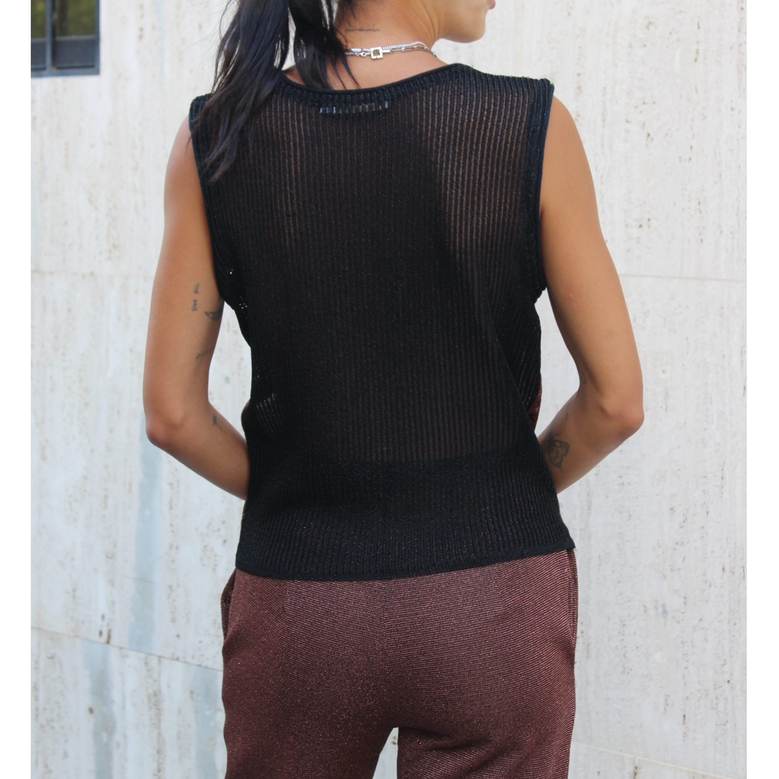 Amarantha sleeveless top is great for your evening style, designed with a shimmering metallic front and a contrasting sheer black net back for a bold yet elegant twist. Featuring a relaxed fit and a round neckline, it pairs effortlessly with trousers or skirts, adding a modern edge to your look. Perfect for nights out or stylish gatherings. Pair it with the designer’s Amarantha trousers for a confident, head-turning ensemble.