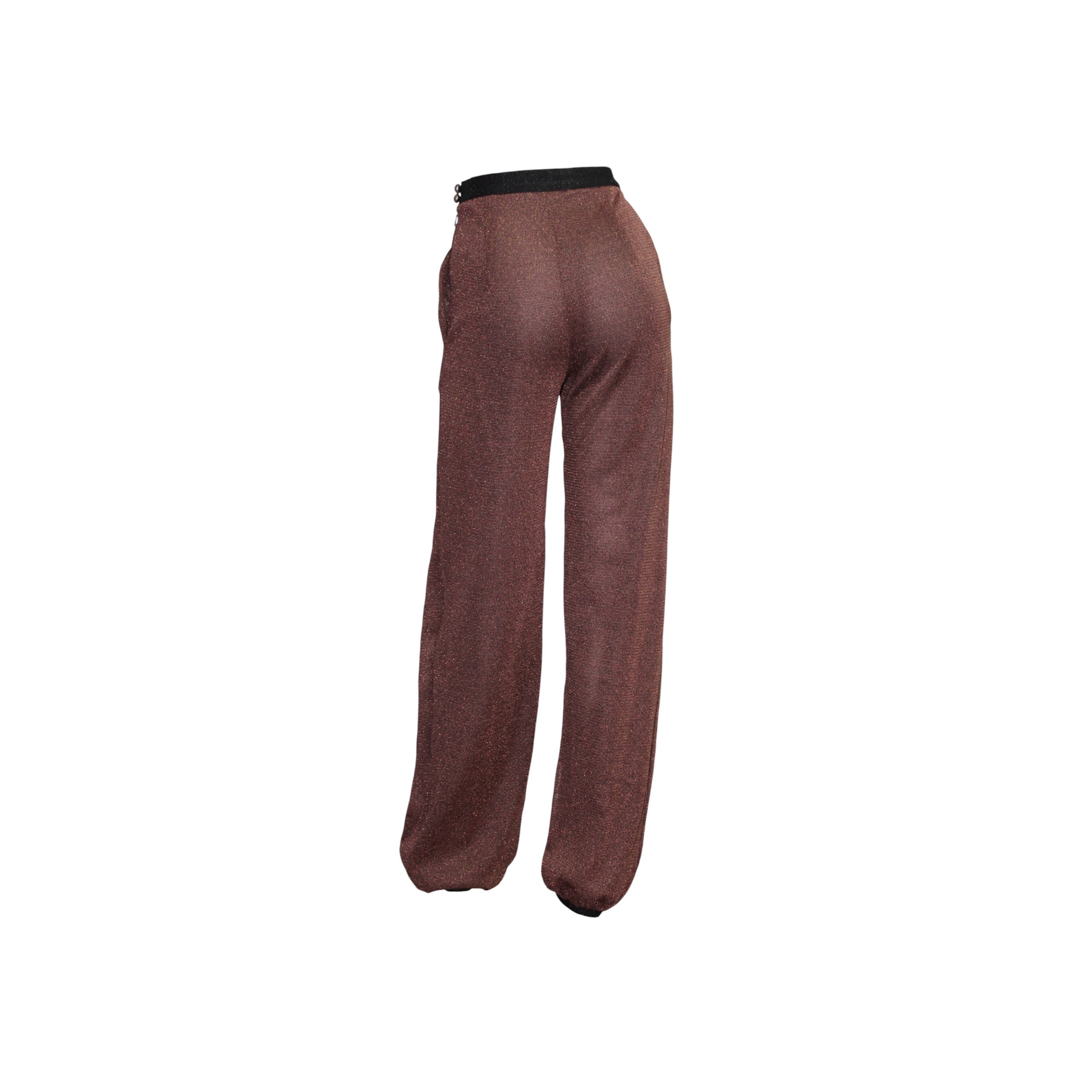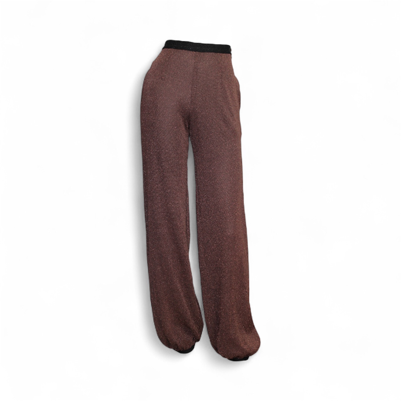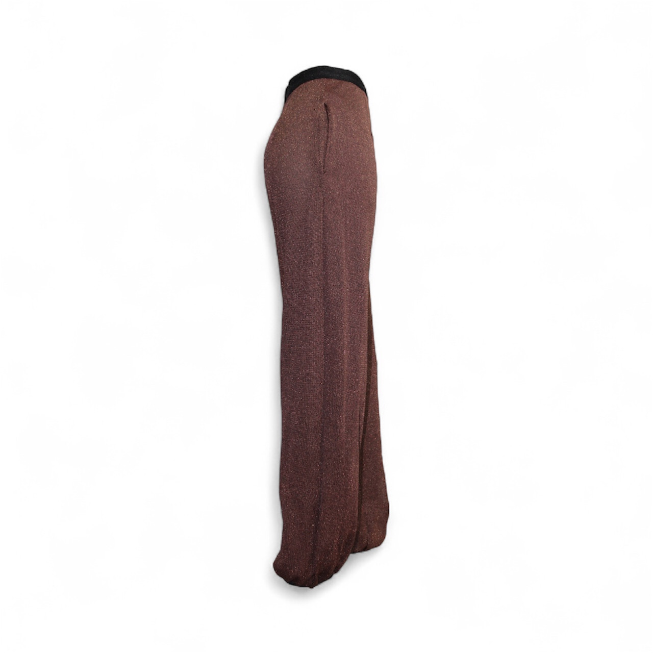 Step into effortless sophistication with these high-waisted metallic trousers. Crafted from a lightweight shimmering fabric, they feature a straight cut that tapers into a subtle balloon-style finish at the hem. The side pockets add practicality, while the rich brown shimmer makes them a versatile piece for day-to-night styling. Match it with the designer’s Amarantha Top for your evening outings.