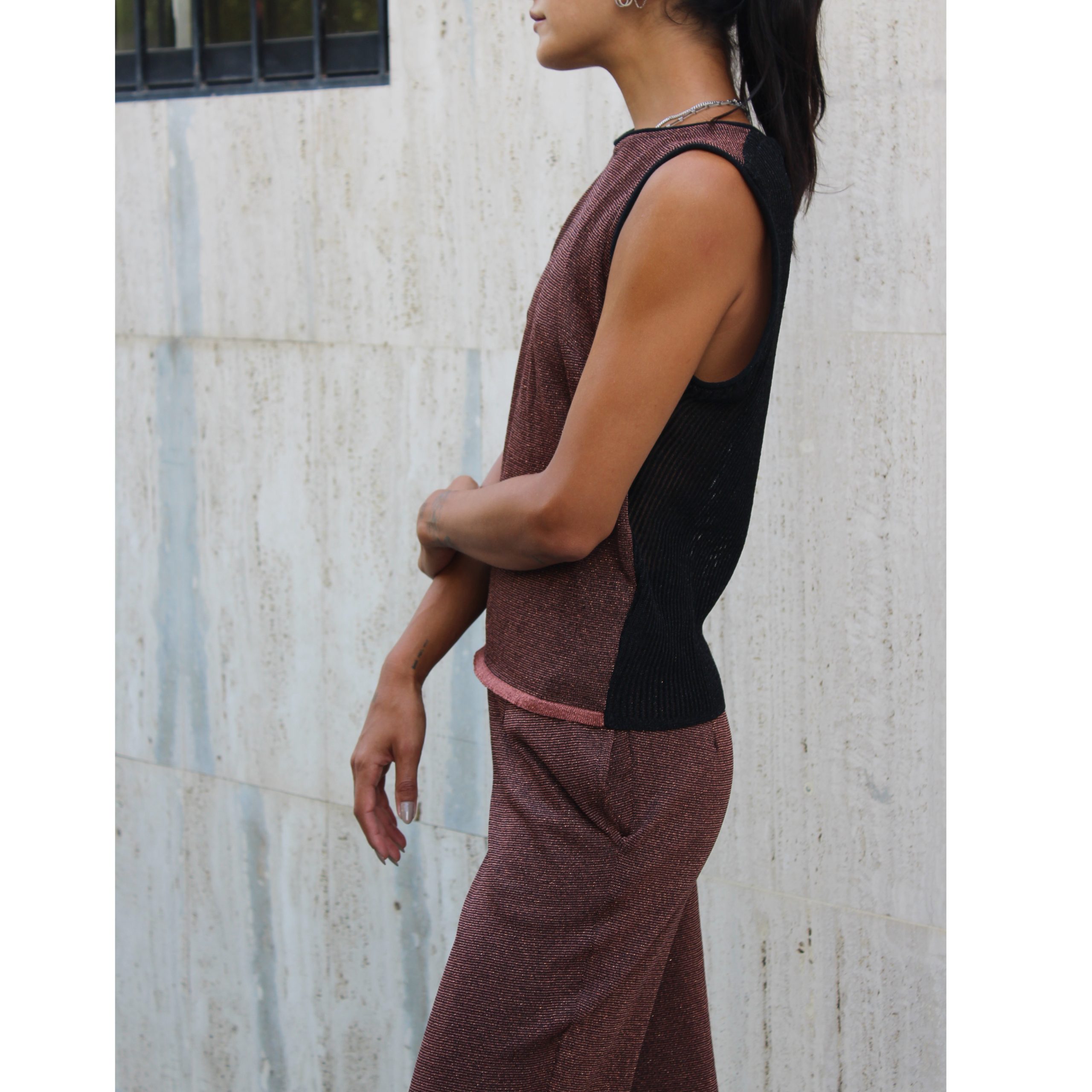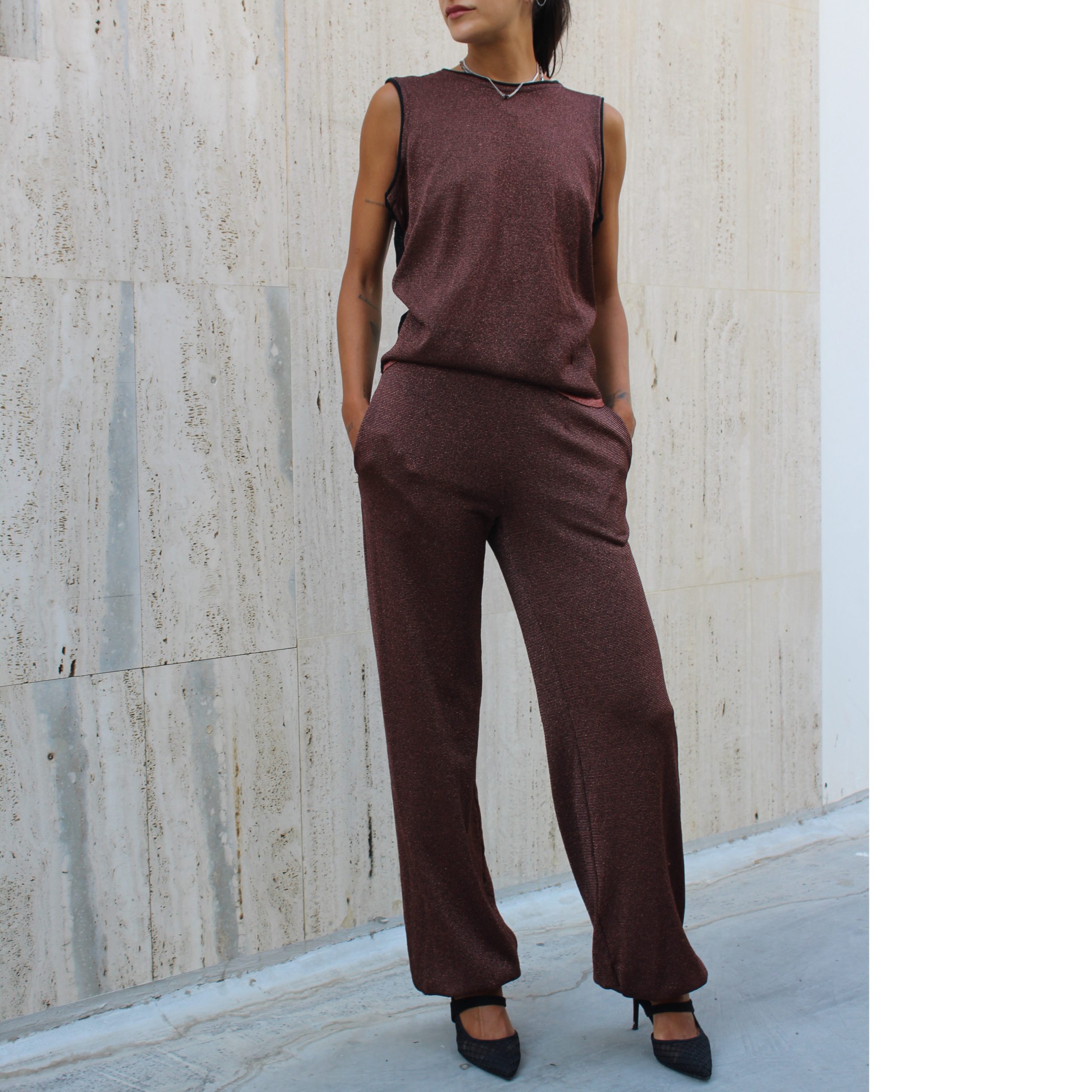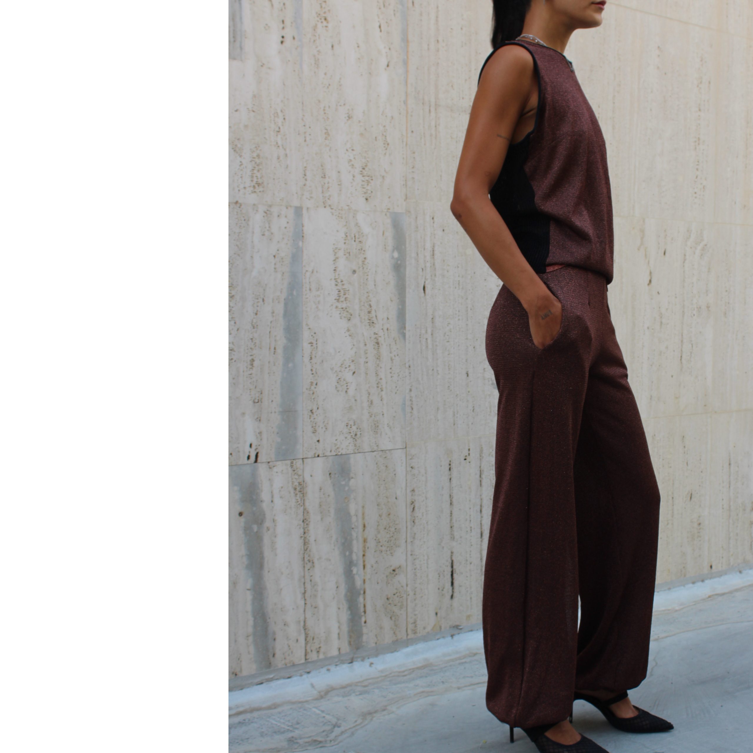Step into effortless sophistication with these high-waisted metallic trousers. Crafted from a lightweight shimmering fabric, they feature a straight cut that tapers into a subtle balloon-style finish at the hem. The side pockets add practicality, while the rich brown shimmer makes them a versatile piece for day-to-night styling. Match it with the designer’s Amarantha Top for your evening outings.
